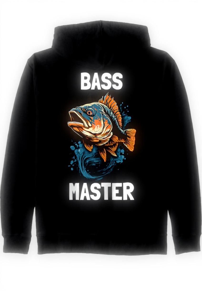 Diese Kapuzenjacke verfügt über ein auffälliges Barsch-Motiv mit dem Spruch “Bass Master”, ein AI-generiertes Design für einzigartige Optik, ein leichtes Material von 241 Gramm für angenehmen Tragekomfort, einen klassischen Schnitt für universelle Passform und einen verstärkten Nackenbereich für zusätzliche Haltbarkeit.