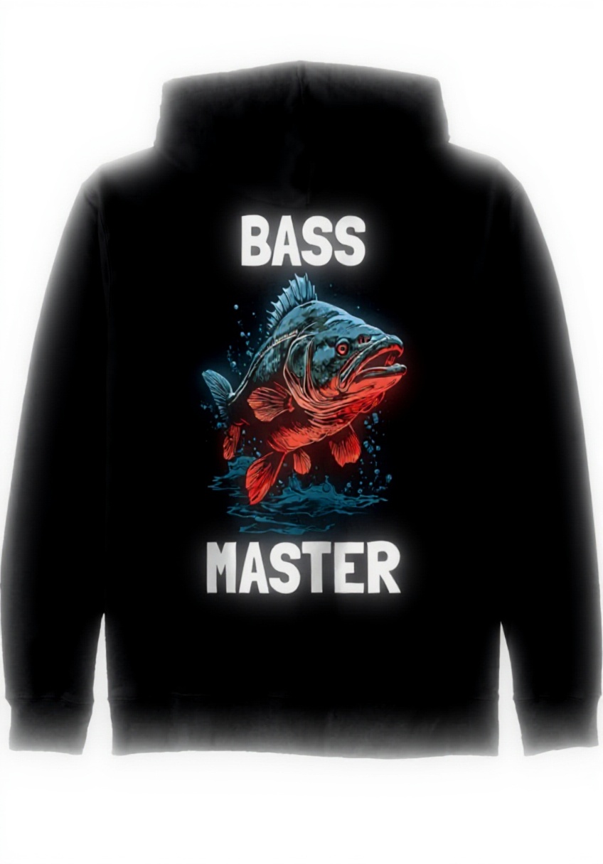 Diese Kapuzenjacke überzeugt mit einem auffälligen Barsch-Design und dem Schriftzug ‘Bass Master’, das mittels KI gestaltet wurde. Hergestellt aus hochwertigen Materialien, ist sie mit 241 Gramm extrem leicht und bietet einen klassischen Schnitt für optimale Bewegungsfreiheit. Der verstärkte Nacken sorgt für zusätzlichen Komfort und Langlebigkeit.