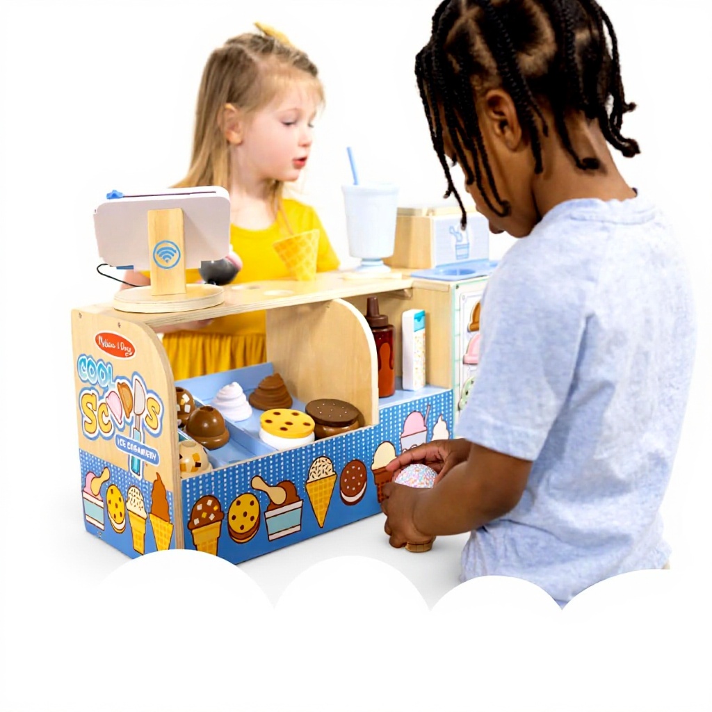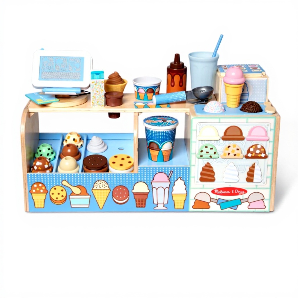 Das Melissa & Doug Holz-Eiscafé ist ein 42-teiliges Spielset aus stabilem, FSC-zertifiziertem Holz. Es umfasst eine detailreiche Eiscafé-Theke mit einem funktionierenden Softeis-Spender, magnetischen Tafeln zur Menügestaltung, einer Ausstellungsfläche für Eisbecher und praktischem Stauraum. Die liebevoll gestalteten Accessoires wie Löffel, Becher und bunte Eisportionen laden zu fantasievollen Spielszenen ein.