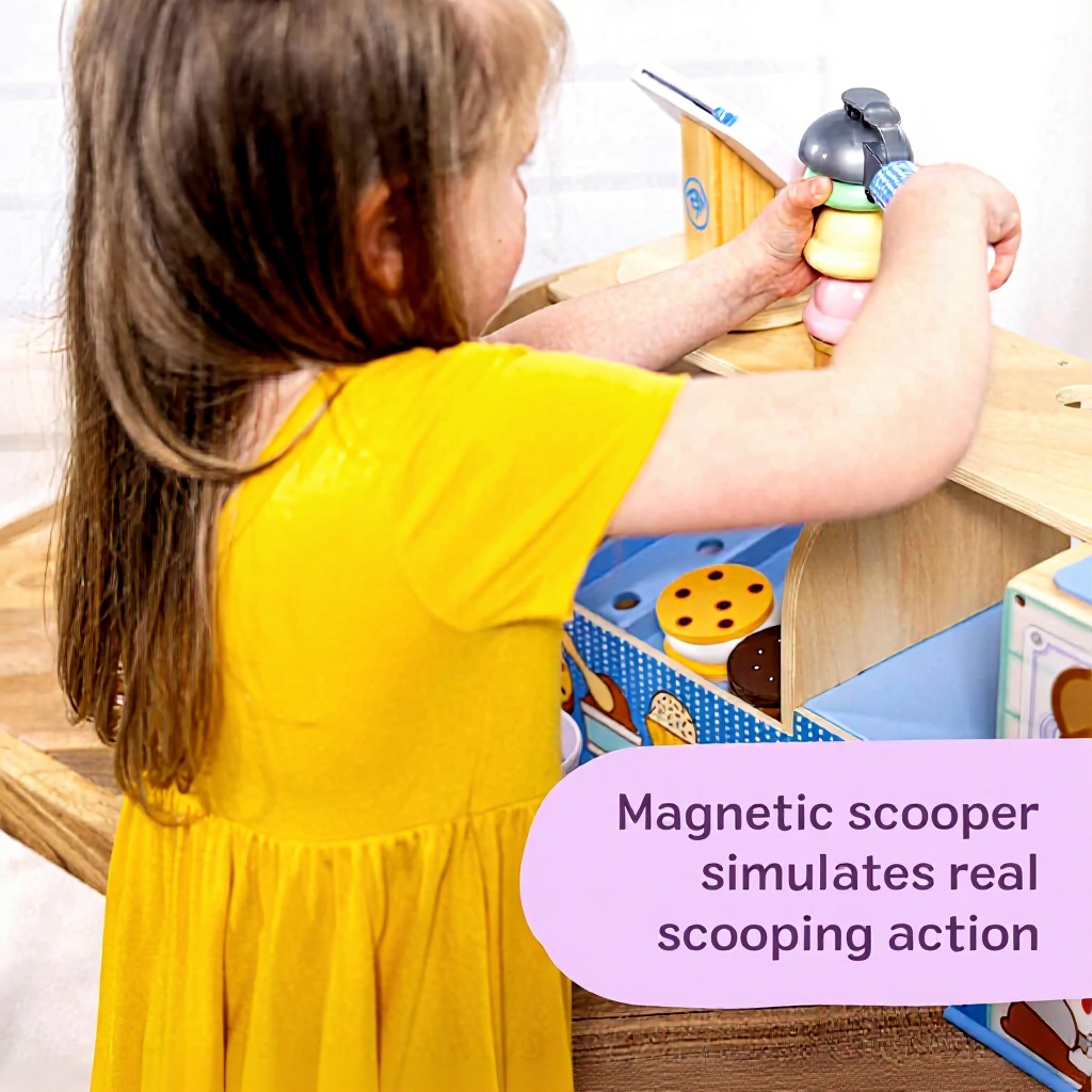 Ideal für das Rollenspiel zu Hause, im Kindergarten oder bei Spieltreffen. Kinder können Alltagssituationen nachspielen, indem sie als Eisdielenbetreiber Bestellungen aufnehmen, Eis kreativ zusammenstellen und mit Freunden oder Familie interagieren. Perfekt für ruhige Spielstunden oder gesellige Aktivitäten.