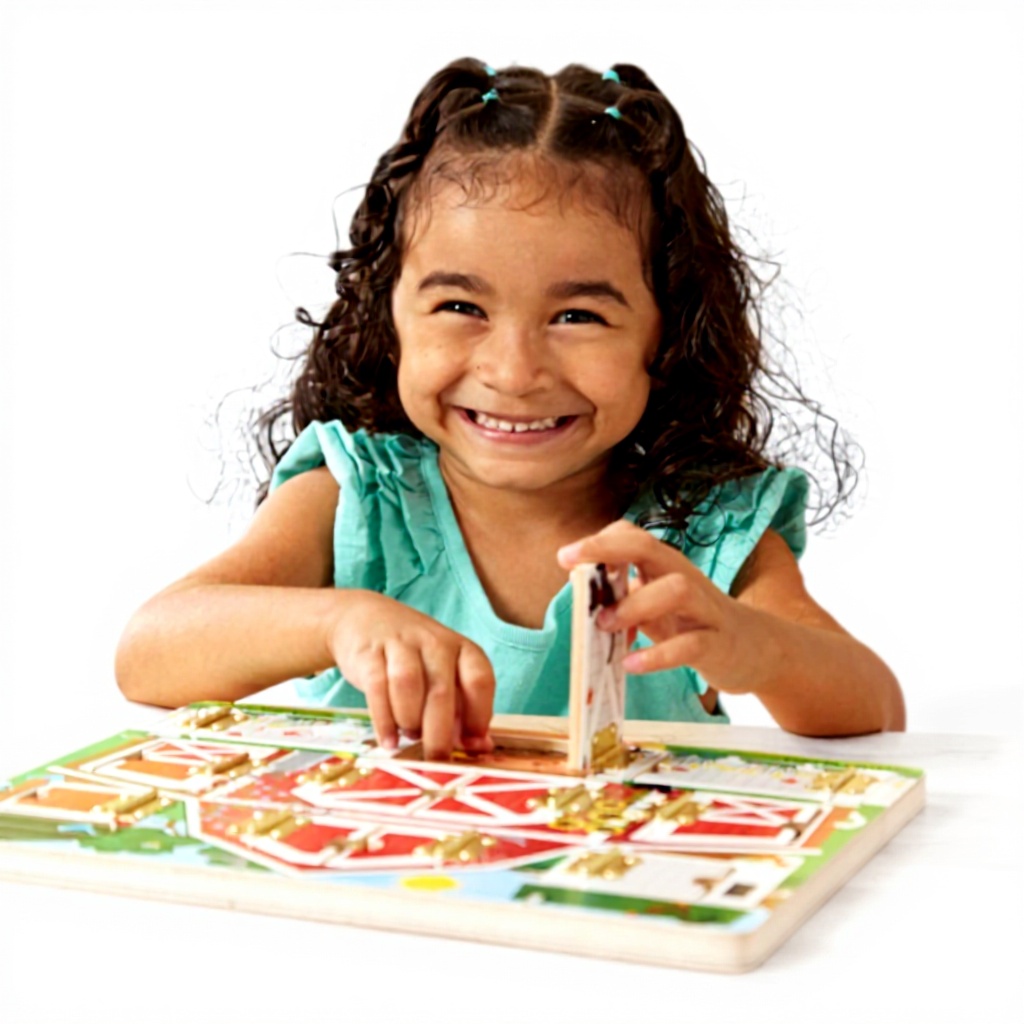 Das Melissa & Doug Versteckspiel Bauernhof ist ein hochwertiges Magnetspielzeug aus Holz mit schwenkbaren Türen. Hinter jeder Tür verbergen sich magnetische Tiere, die Kinder herausnehmen und wieder platzieren können. Dieses Spiel fördert spielerisch die Feinmotorik und die Match-Fähigkeit durch interaktives Entdecken.