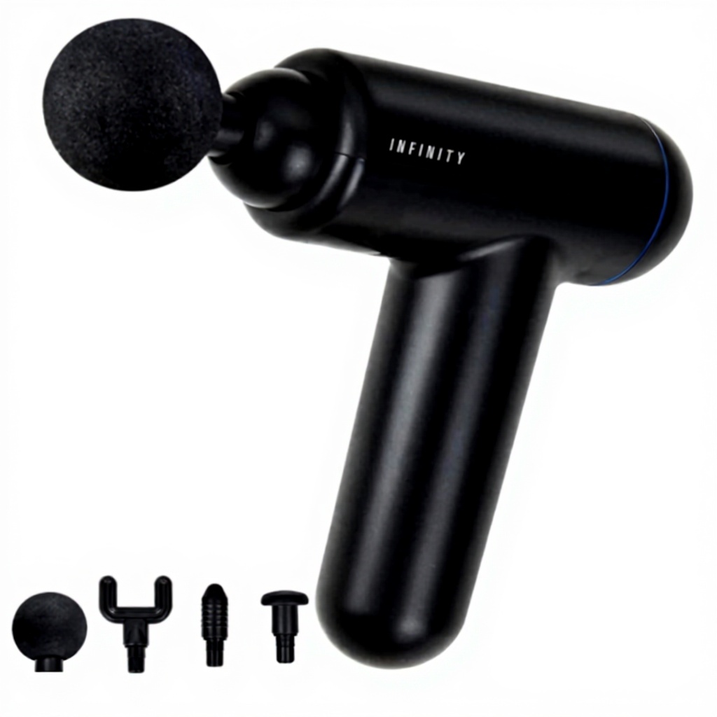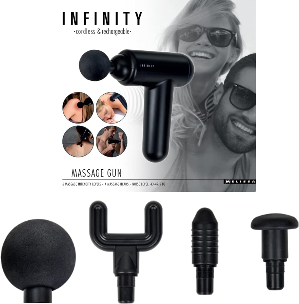 Die Melissa INFINITY Massagepistole ist ein professionelles Handmassagegerät mit 4 austauschbaren Aufsätzen und 6 Intensitätsstufen. Das wiederaufladbare Gerät verfügt über einen integrierten Akku für bis zu 5 Stunden kabellose Anwendung und eine automatische Abschaltfunktion bei zu festem Druck.