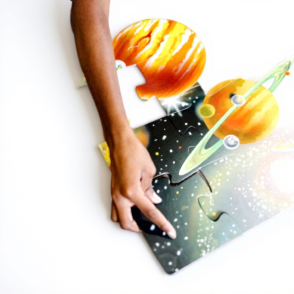 Das Puzzle fördert multiple Entwicklungsbereiche: feinmotorische Fähigkeiten durch das Greifen und Platzieren der Teile, kognitive Fähigkeiten durch das Erkennen von Formen und Mustern, sowie naturwissenschaftliches Grundwissen durch das Sonnensystem-Motiv.