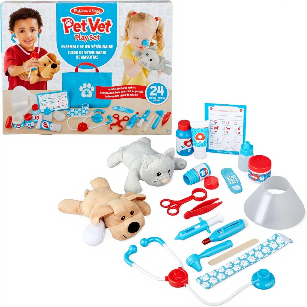Das 24-teilige Tierarzt Spielset von Melissa & Doug enthält einen kuscheligen Plüschhund und eine Plüschkatze sowie umfangreiches, kindgerechtes Arztzubehör wie Stethoskop, Spritze, Thermometer und Verbände. Hergestellt aus hochwertigen Materialien wie Polyester, Kunststoff und Holz, unterstützt es fantasievolle Rollenspiele ohne Batteriebedarf.