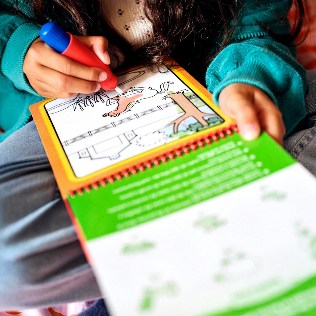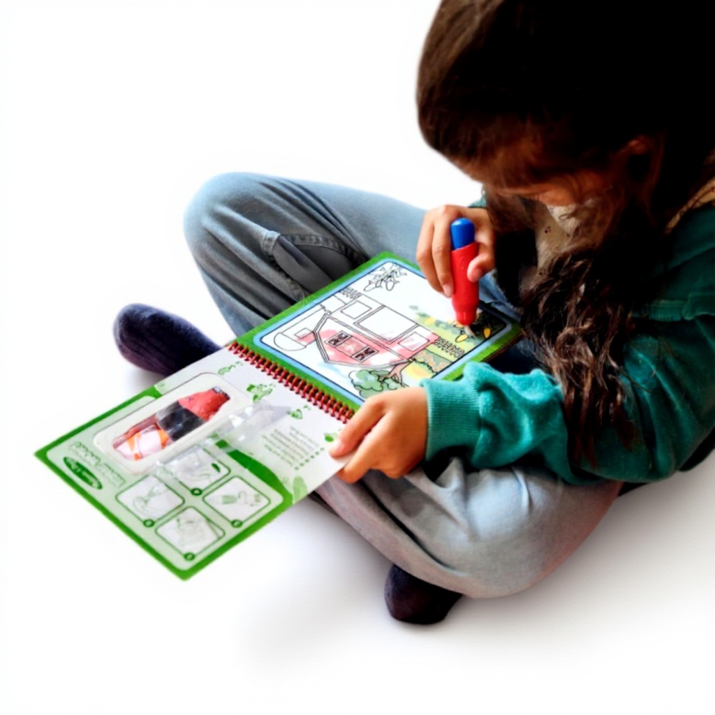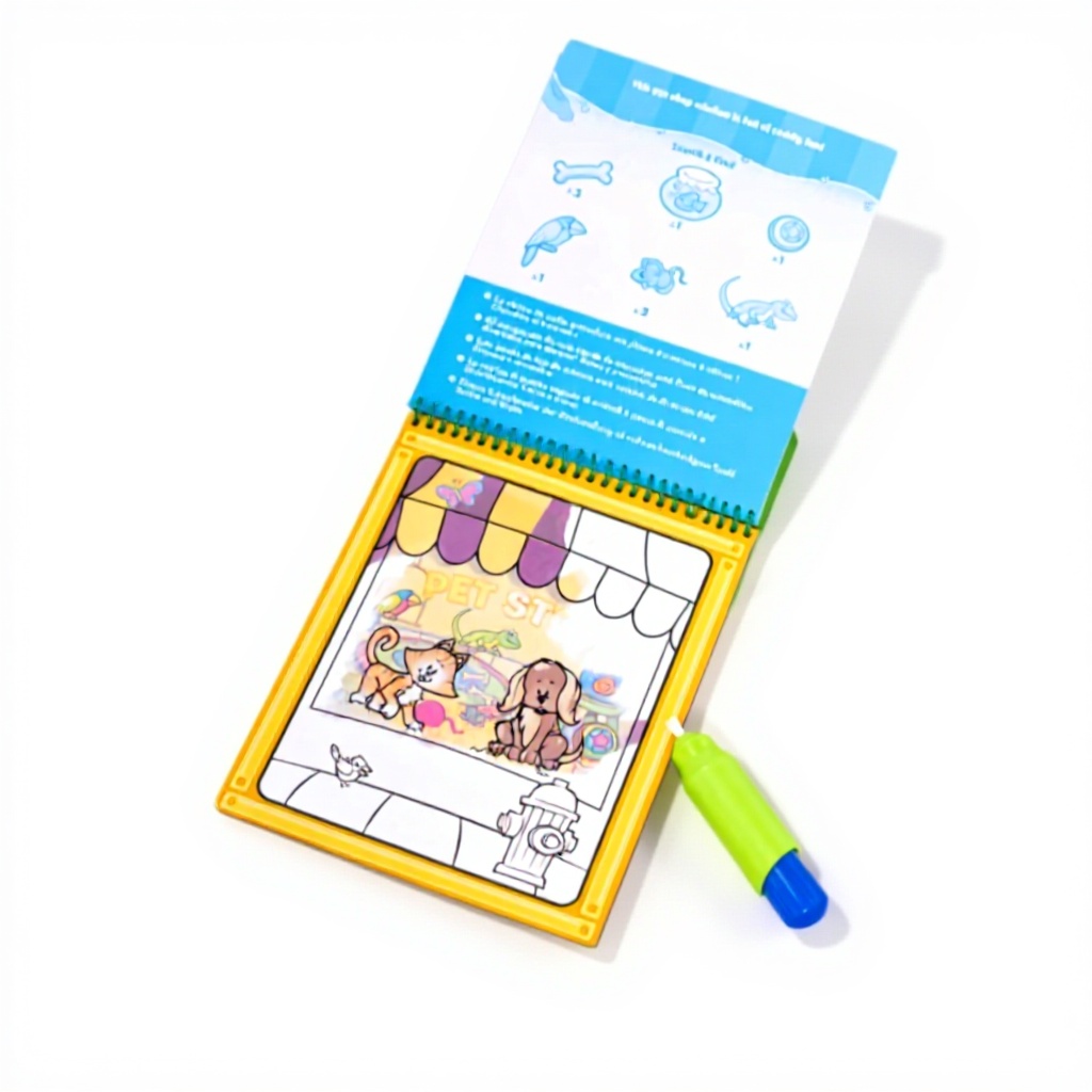 Das Malbuch enthält Seiten, die mit Wasser bemalt werden, um Farben sichtbar zu machen. Nach dem Trocknen verschwinden die Farben, und die Seiten können erneut verwendet werden.